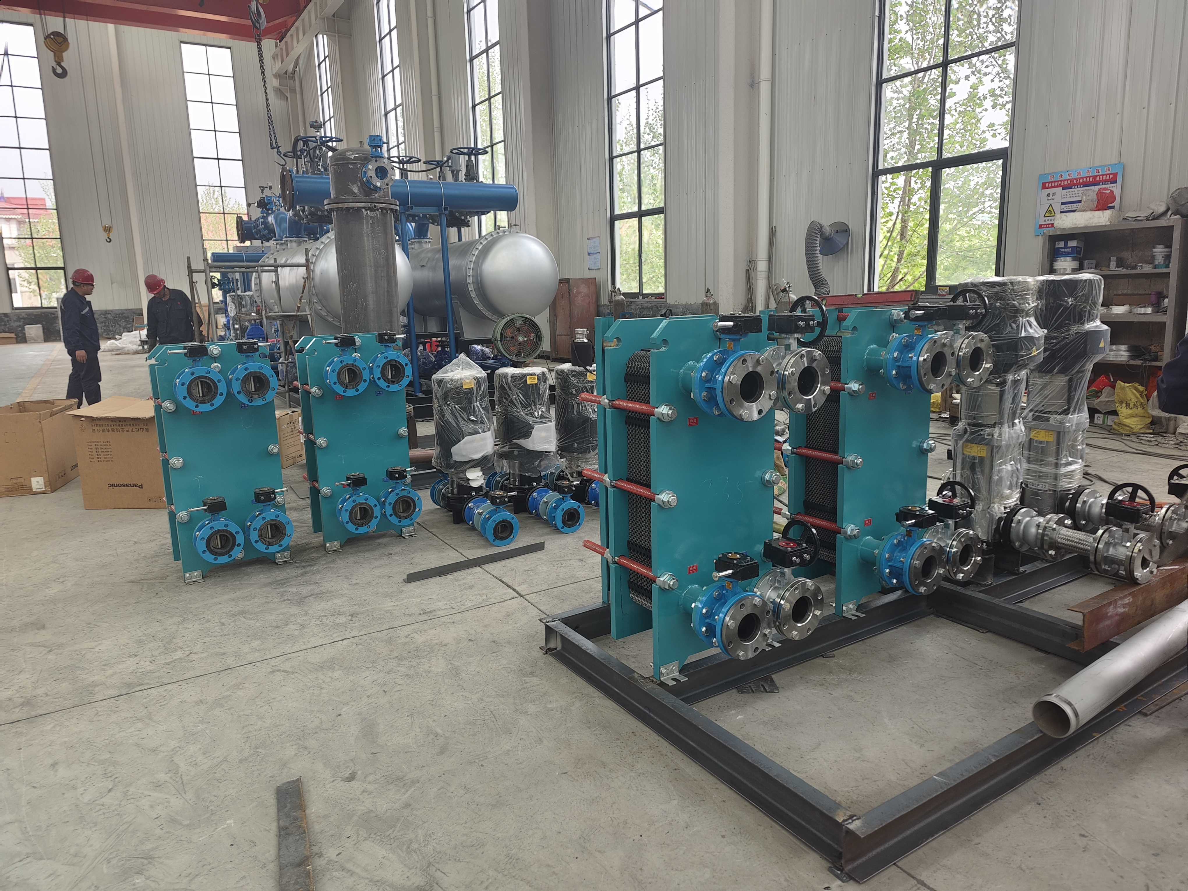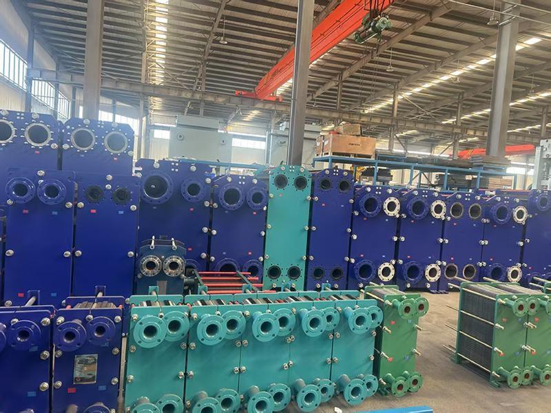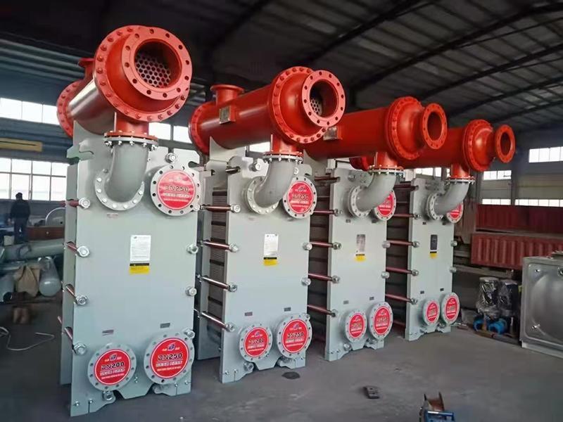 板式换热器由传热波纹板片及框架组成。板片由螺栓夹紧在固定压紧板及活动压紧板之间,在换热器内部就构成了许多流道,板与板之间用橡胶密封。压紧板上有本设备与外部连接的接管。板片用耐腐蚀金属薄板压制而成,四角冲有供介质进出的角孔,上下有挂孔。人字形波纹能增加对流体的扰动,使流体在低速下能达到湍流状态,获得高的传热效果。并采用特殊结构,保证两种流体介质不会串漏。