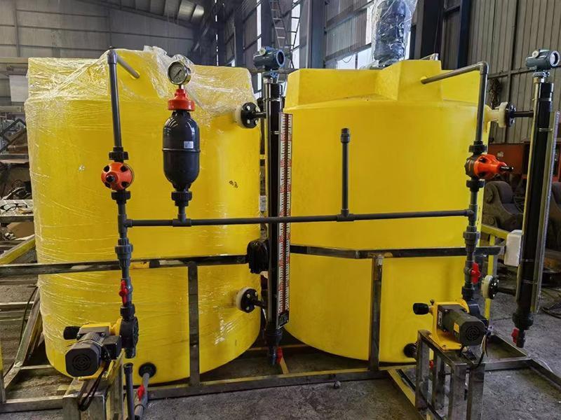 溶解桶配有液位计、低液位报警、阀门等自动运行所需的设施。通体外壁装磁翻板液位计,实时观测桶内液位,在通体上面有进料口,备用口,在桶体侧面备有出料口、排污口、溢流口、液位计接口以及相应配套的阀门。当桶内液位小于设低液位值时,自动开启报警系统,加药泵暂停。加药系统包括离心泵,电磁流量计和相关阀门等。