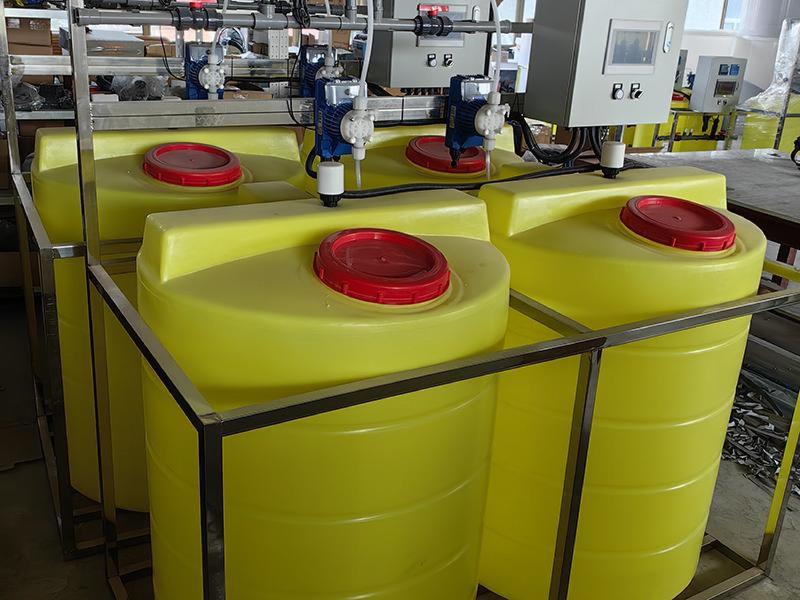 溶解桶配有液位计、低液位报警、阀门等自动运行所需的设施。通体外壁装磁翻板液位计,实时观测桶内液位,在通体上面有进料口,备用口,在桶体侧面备有出料口、排污口、溢流口、液位计接口以及相应配套的阀门。当桶内液位小于设低液位值时,自动开启报警系统,加药泵暂停。加药系统包括离心泵,电磁流量计和相关阀门等。